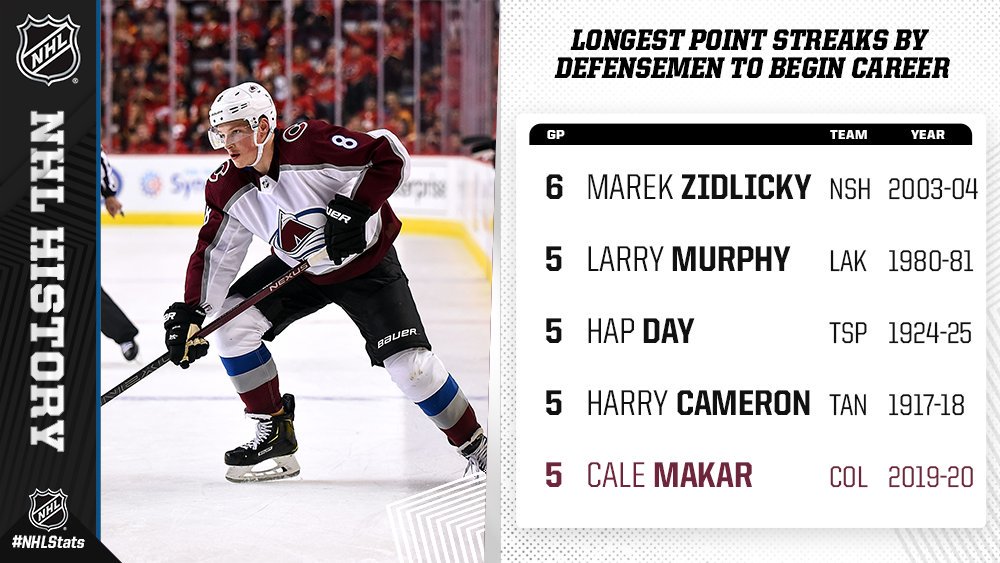 Only one defenseman in NHL history has began their career with a longer point streak than Cale Makar. #NHLStats