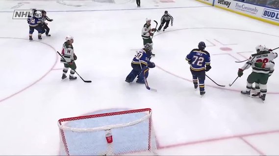 Binnington hyökkäsi viime yön NHL-kierroksella Minnesota Wildin hyökkääjän Ryan Hartmanin kimppuun, joka oli juuri tehnyt 5-4-johtomaalin ja osunut sen jälkeen Blues-vahtiin.