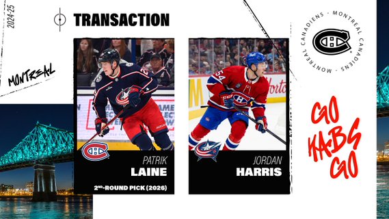 Blue Jackets saa kaupassa vastikkeena puolustaja Jordan Harrisin, kun taas Canadiensiin siirtyy Laineen ohella 2. kierroksen varausvuoro kesälle 2026.