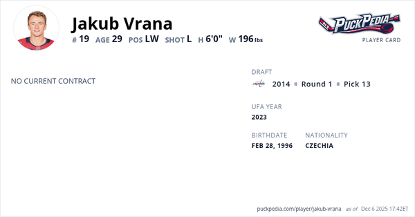 Capitals on solminut yksivuotisen ja 775 000 dollarin arvoisen yksisuuntaisen sopimuksen Vranan kanssa. 28-vuotias tshekkitaituri pelasi harjoituskaudella testisopimuksella Capitalsin mukana neljä ottelua pistein 1+1.
