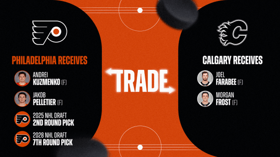 Flames lähettää kaupassa hyökkääjät Andrei Kuzmenkon ja Jakob Pelletierin Philadelphiaan. Vastikkeena toiseen suuntaan siirtyy hyökkääjät Joel Farabee ja Morgan Frost.