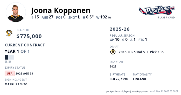 27-vuotias Koppanen on pelannut tällä kaudella Penguinsin NHL-joukkueen mukana kymmenen ottelua tehopistein 1+0.