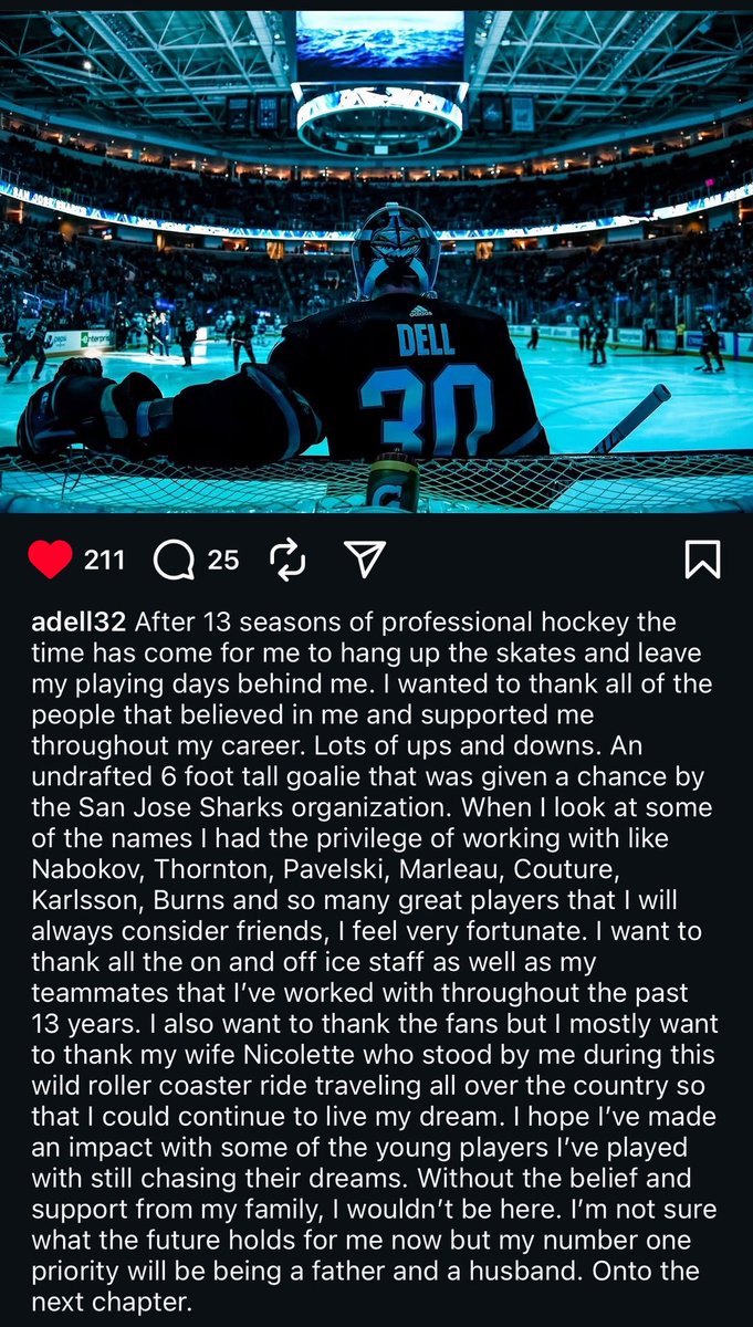 – 13 vuotta kestäneen ammattilaisuran jälkeen minun on tullut aika ripustaa luistimet naulaan ja jättää pelipäivät taakse. Haluan kiittää kaikkia ihmisiä, jotka uskoivat minuun ja tukivat minua läpi urani. Minulla oli paljon ylä- ja alamäkiä. Varaamaton 183-senttinen maalivahti, joka sai mahdollisuuden San Jose Sharksin organisaatiolta. Sain kunnian pelata sellaisten nimien kuten Nabokov, Thornton, Pavelski, Marleau, Couture, Karlsson, Burns ja lukuisten muiden loistavien pelaajien kanssa, joita pidän ystävinä – tunnen oloni hyvin onnekkaaksi, Dell kertoo Instagram-julkaisussaan.