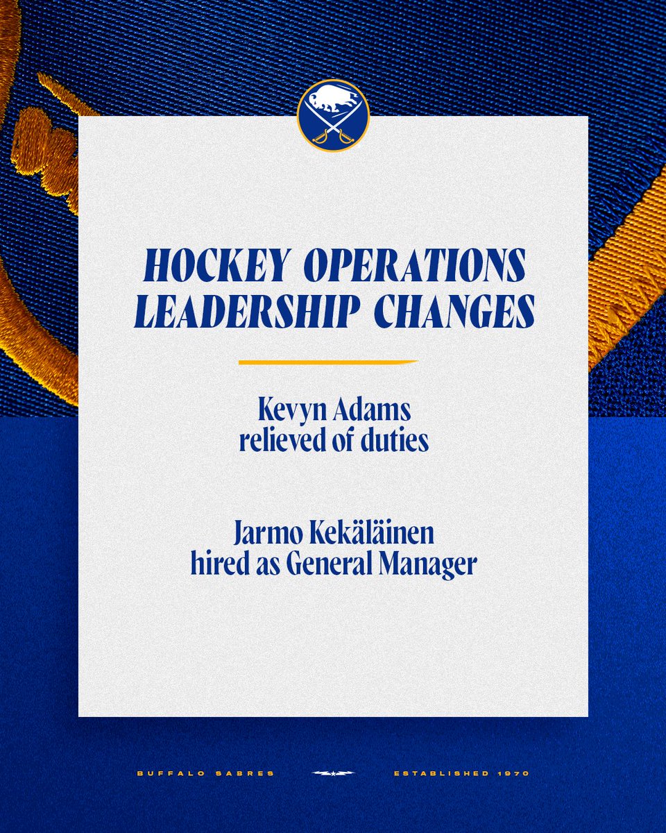 Sabresissä vuodesta 2020 lähtien GM:nä toiminut Kevyn Adams on irtisanottu tehtävistään. Sabres ei päässyt koskaan Adamsin alaisuudessa pudotuspeleihin ja on tälläkin kaudella uhkaavasti jäämässä ulos.