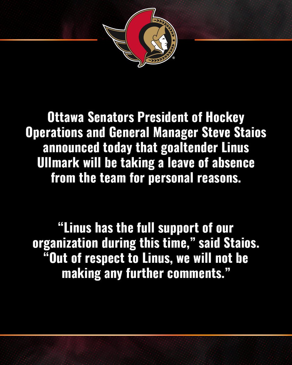 Ottawa Senatorsin tähtimaalivahti Linus Ullmark jää sivuun joukkueen toiminnasta määrittelemättömäksi ajaksi.