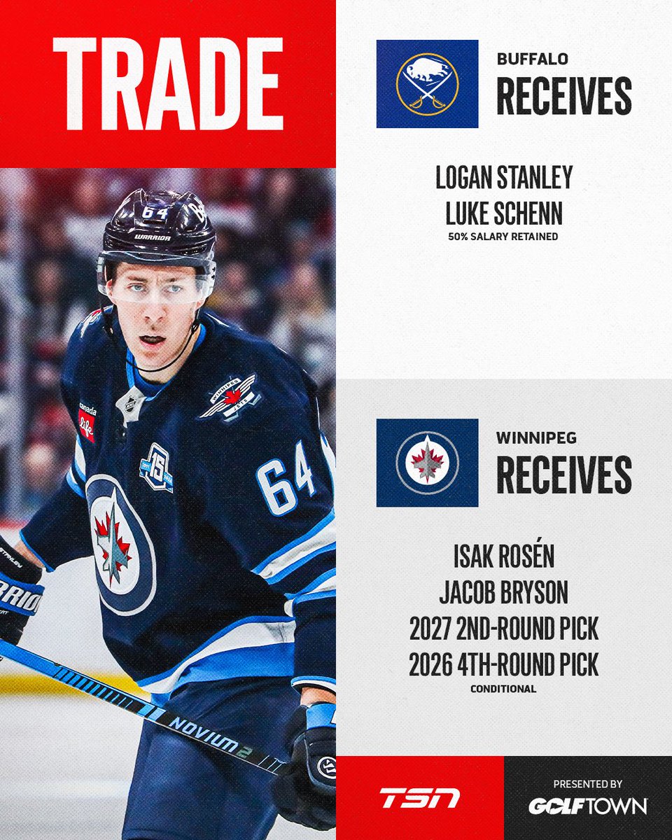 Buffalo on hankkinut Winnipeg Jetsistä puolustajat Luke Schennin ja Logan Stanleyn. Vastineeksi Buffalo antoi Winnipegille puolustaja Jacob Brysonin, hyökkääjä Isak Rosenin, 4. kierroksen varausvuoron tämän kesän varaustilaisuuteen sekä 2. kierroksen varausvuoron vuodelle 2027. Winnipeg pidättää puolet Schennin 2,75 miljoonan dollarin vuosipalkasta.
