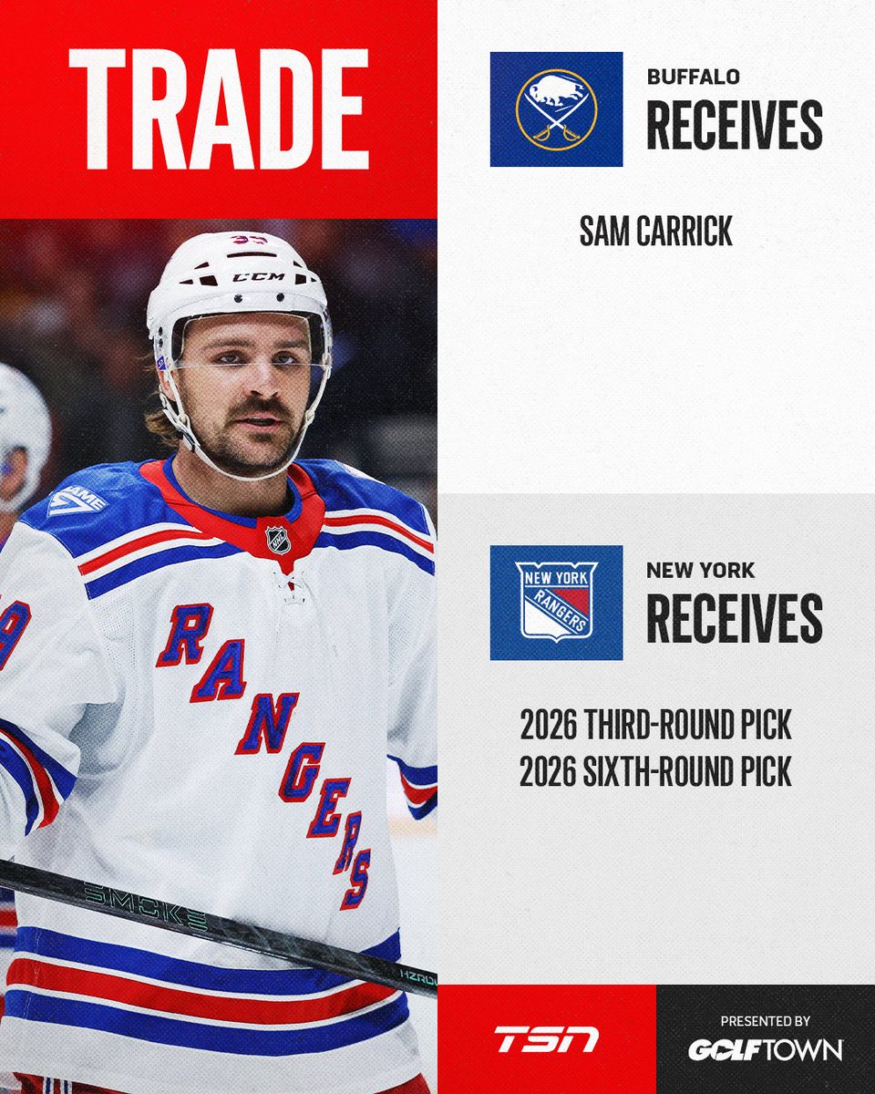 Lisäksi Buffalo on värvännyt New York Rangersista hyökkääjä Sam Carrickin. Rangers saa Buffalolta 3. ja 6. kierroksen varausvuorot tämän kesän draftiin.