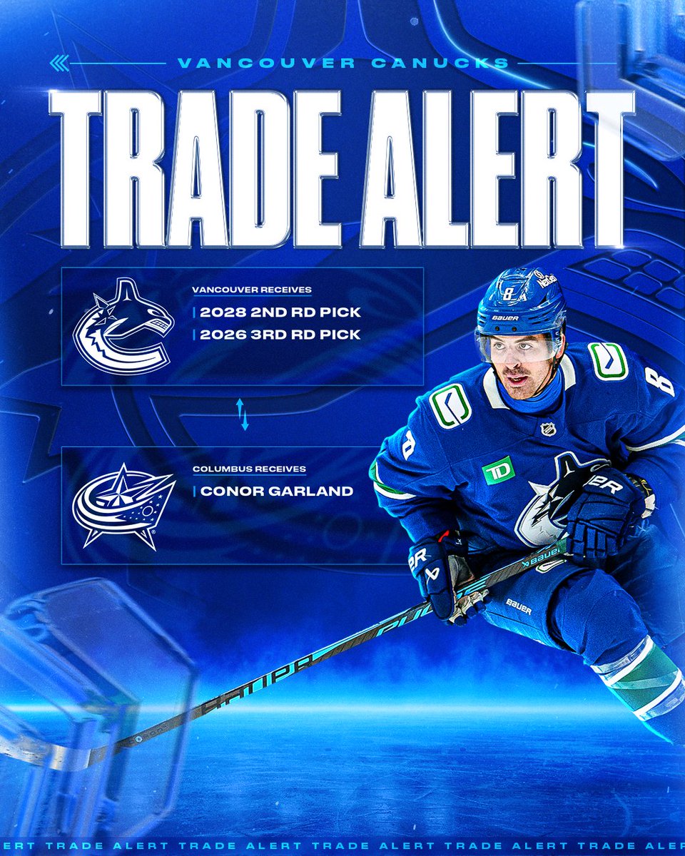 Vancouverin hyökkääjä Conor Garland siirtyy Columbuksen riveihin. Vastineeksi Vancouver saa 3. kierroksen varausvuoron tämän kesän varaustilaisuuteen sekä 2. kierroksen varausvuoron vuodelle 2028.