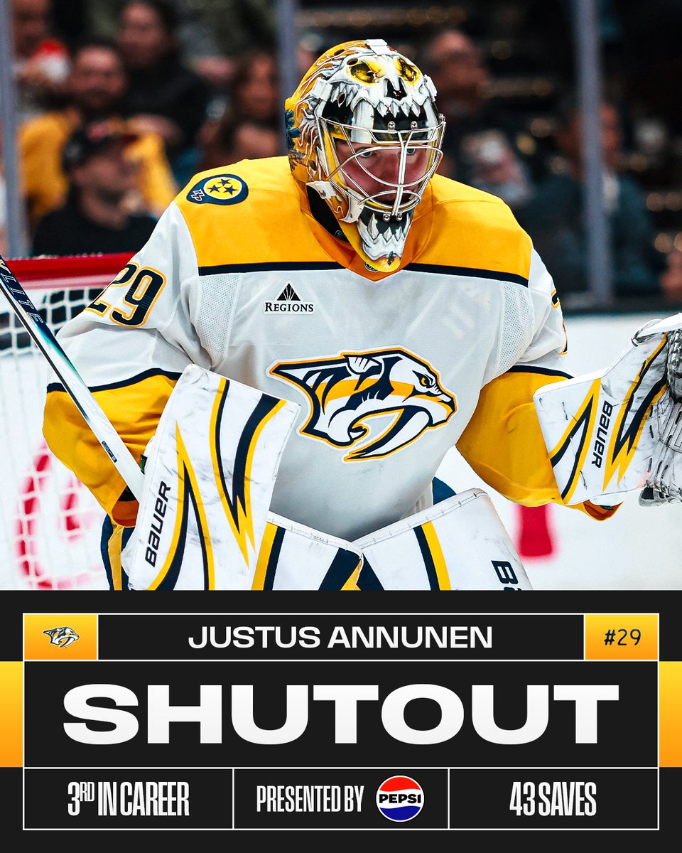 Nashville Predatorsin suomalaisvahti Justus Annunen torjui nollapelin, kun Predators kaatoi Anaheim Ducksin numeroin 5-0. Annunen kirjautti ottelussa peräti 43 torjuntaa.
