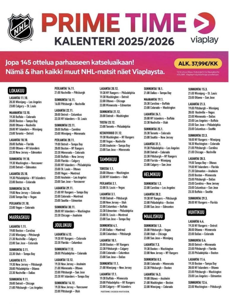 Kaudella 2025-26 myös uusi Viaplay TV -ilmaiskanava näyttää ilmaiseksi yksittäisiä NHL-otteluita.